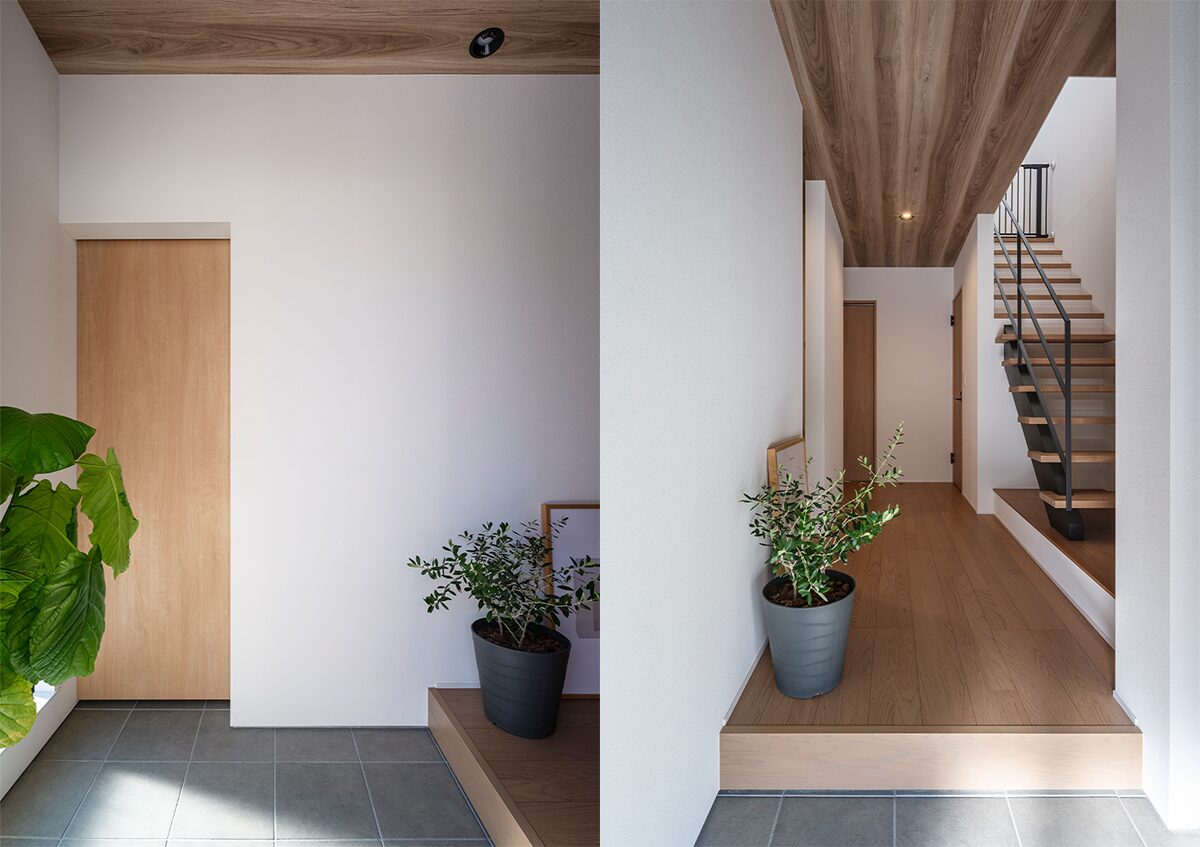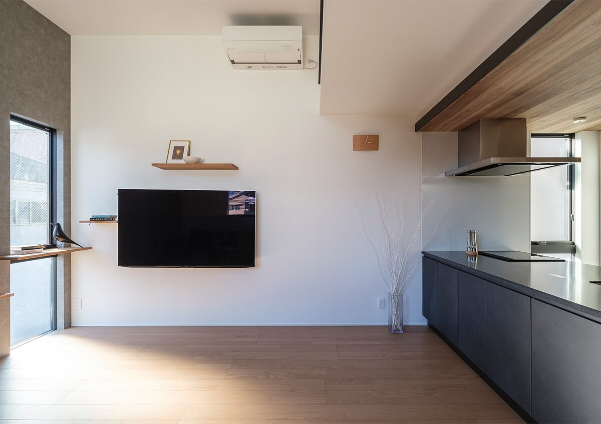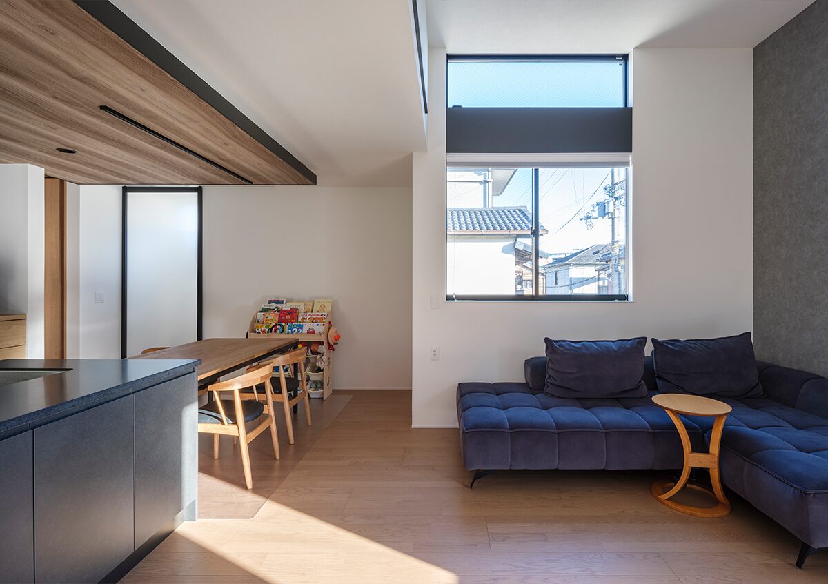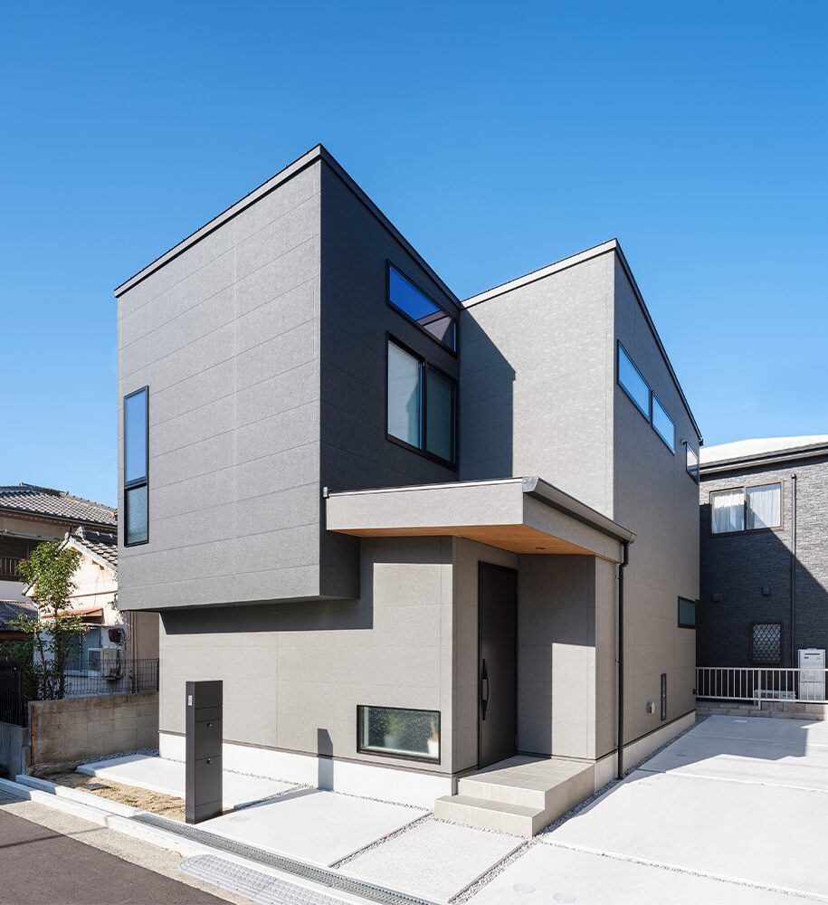 施主様インタビュー | 2026.01.20 住宅地でありながら開放的な住空間を実現するため、メインの居住空間を2階に配置。視線が高く抜けるリビングの窓から、ゆったりと流れる空を眺めながら、家族が寛ぎ集う住まいを実現されたAさまに家づくりのお話をお聞きしました。 DATA ●構造・規模/木造[金物工法]・地上2階 ●敷地面積/119.52㎡[36.1坪] ●延床面積/101.18㎡[30.6坪] ●本体価格/1500~2000万円 この住まいの実例写真を見る ー 当社で家を建てると決めたきっかけをお聞かせください。 妻 アドヴァンスさんを知ったきっかけは親戚の紹介でしたが、見学会で実際のお住まいを体感し、そのお洒落な雰囲気に惹かれ、「ここなら、私たちの理想の家づくりが叶いそうだ」と感じたことが決め手でした。 ー どのような要望を伝えていただきましたか。 妻 SNSで「素敵だな」「こんな家にしたいな」と思った間取りや仕様を集め、言葉だけでなくイメージと一緒に要望を共有しました。特に水まわりにはこだわりがあり、洗面・脱衣室・ランドリールームを分けた構成にしたいという強い希望をお伝えしました。 玄関ドアを開けると、観葉植物が彩りを添えたすっきりとした空間が出迎えてくれます。玄関ホールは階段から上部へ視線が抜ける構成で、余白と奥行きを感じさせる広がりのある空間です。 ー 見学会ではどのような点を意識して参加されましたか? 妻 希望している広さに近いお住まいを見学しました。間取りを検討している段階だったので、天井の高さや空間の広さを実際に体感できたことで、図面だけでは分からない部分をつかむことができ、とても参考になりました。 ー 注文住宅の良さは何だと思いますか。 妻 これまでの住まいで「こうだったらいいのに」と感じていた点を、自分たちの理想の形で叶えられることだと思います。 ー お勧めしたい空間や建材などはありますか。 妻 やはりベースのクロスは白がおすすめです。空間が広く感じられますし、どんなテイストにも合わせやすいと思います。また、全体の色味は3つまでに抑えることを意識しました。我が家では白や黒、グレー、木目をメインにまとめています。 天井高約3.3mの伸びやかなリビング。白を基調に、オークの床材とブラックのキッチン、グレーのアクセントクロスを組み合わせたインテリアが、空間の上質さと統一感を引き立てています。 ー 実際に暮らしはじめて、動線や使い勝手などはいかがですか? 妻 水まわりの使い勝手は、建てる前にしっかり考えた分、とても良いです。家事と日常生活を同時進行できるのでストレスがなく、家事がぐっと楽になりました。 ー 家づくりを考えている方に何かひとことお願いします。 妻 「こんな家にしたい」というイメージを集めておき、その写真を参考にしながら選んでいくことが、理想の住まいへの近道だと思います。私はSNSで家全体の雰囲気だけでなく、トイレはこの感じ、洗面はこの感じと細かくイメージを集めたことで、理想の家を形にすることができました。 建物側面、外からの視線が届きにくい位置に大きな開口を設け、たっぷりの光を享受できるLDK。ダイニング奥の扉は階段との仕切りとなり、冷暖房効率の向上にも配慮しています。