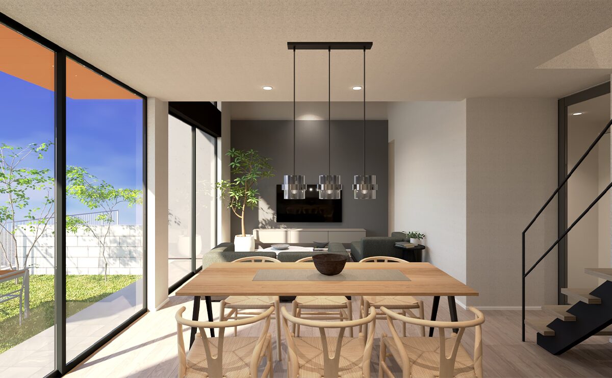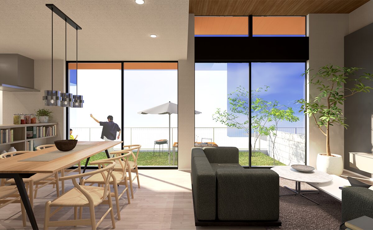 ●高天井と大開口がもたらす、光と開放感に満ちたリビング