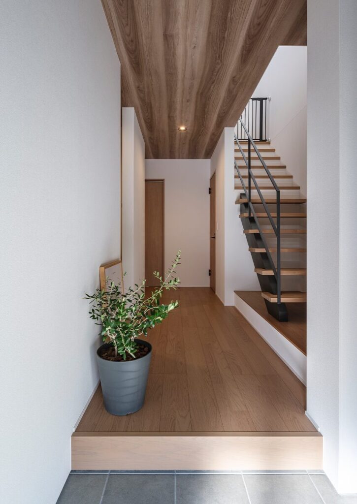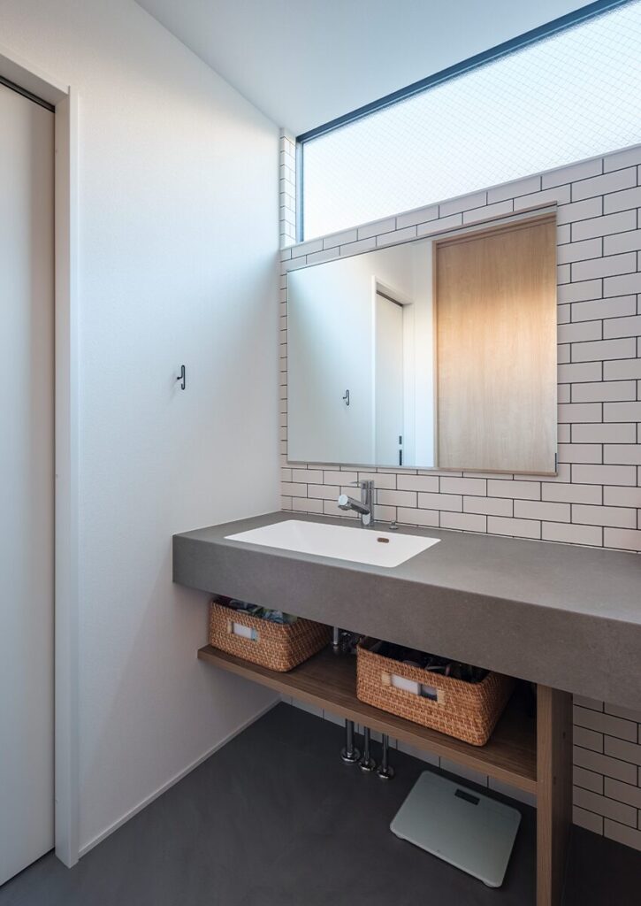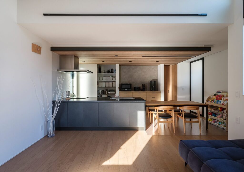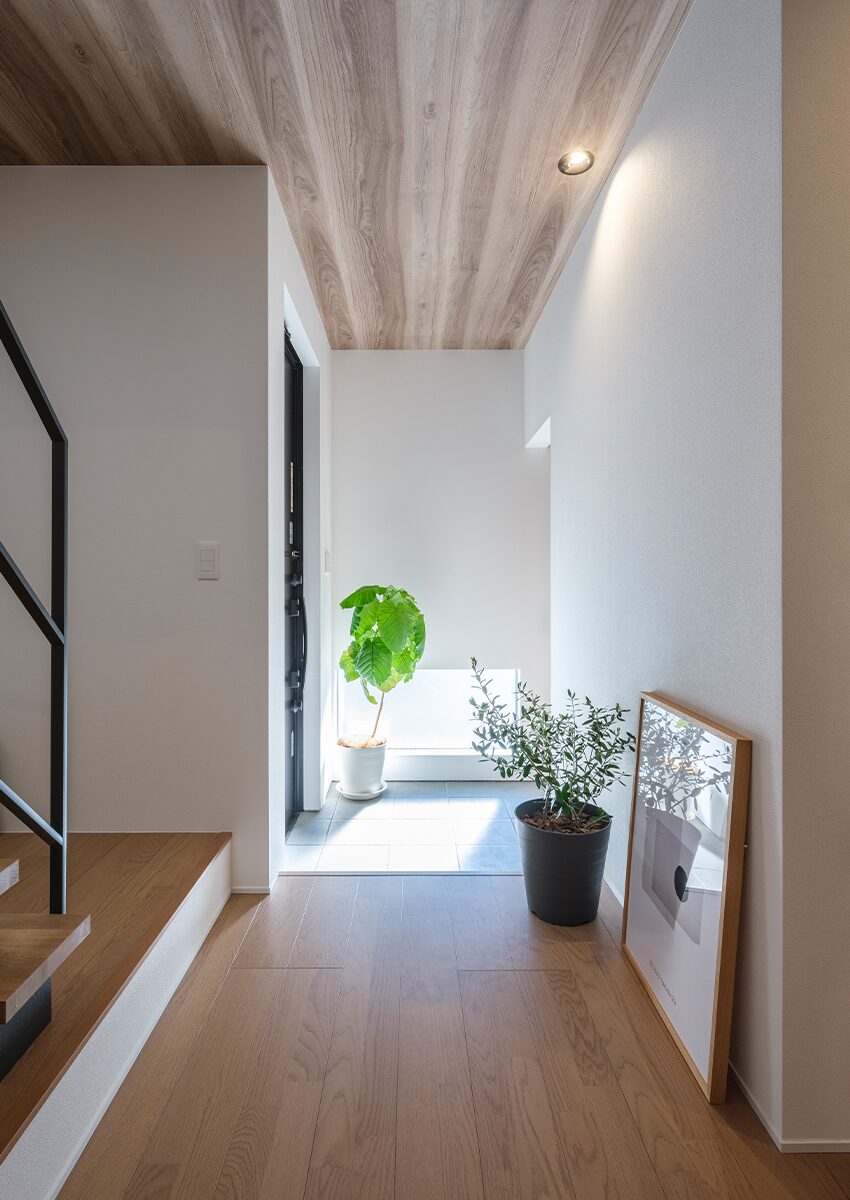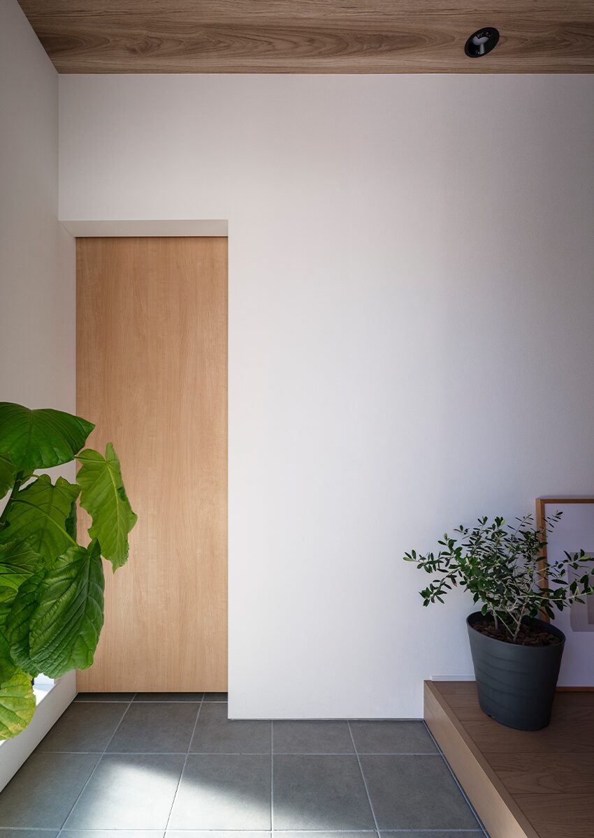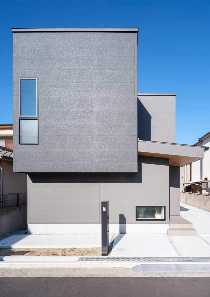 起伏がなく平らな住宅地の中にある敷地での計画です。ご家族はここに周囲からの視線を気にせず、ご家族と愛猫が過ごせる住まいを望まれました。外観はボックス形状と庇を組み合わせ、シンプルながらも印象的な佇まいに仕上げています。内部は1階に各居室を、2階にLDKと水まわりという構成で計画しました。玄関は道路から室内が見えないように側面に配しています。玄関より一歩中に入ると、上部から光が注ぐ階段により、余白と奥行きを期待させる空間が広がります。また、シューズクロークを抜けて手洗い場へ続く家族用動線も確保しています。光に満ちた階段を上がり2階へ向かうと、LDKが広がります。天井高を変えることで、各空間のすみわけをしながら、同じ空間にある心地よさを感じることもできます。高く視線が抜けるリビングで、窓からゆったりと流れる空を眺めながら、愛猫と一緒に寛ぎ集う住まいとなりました。