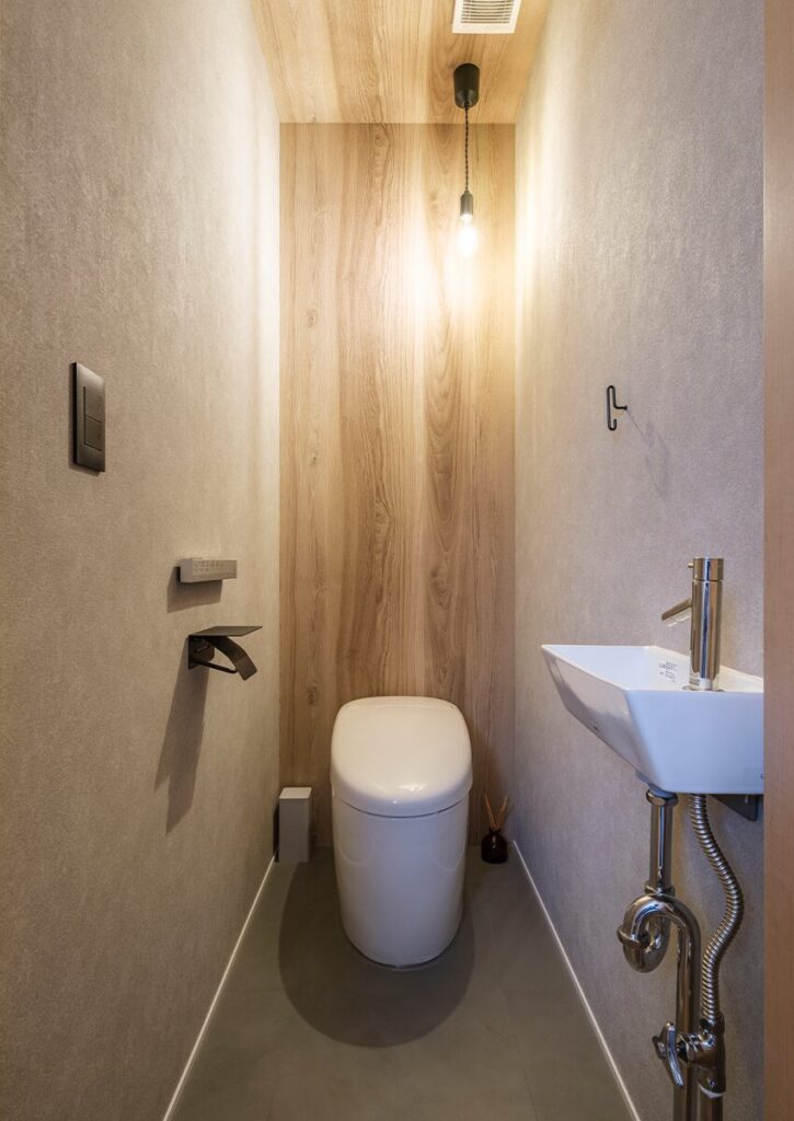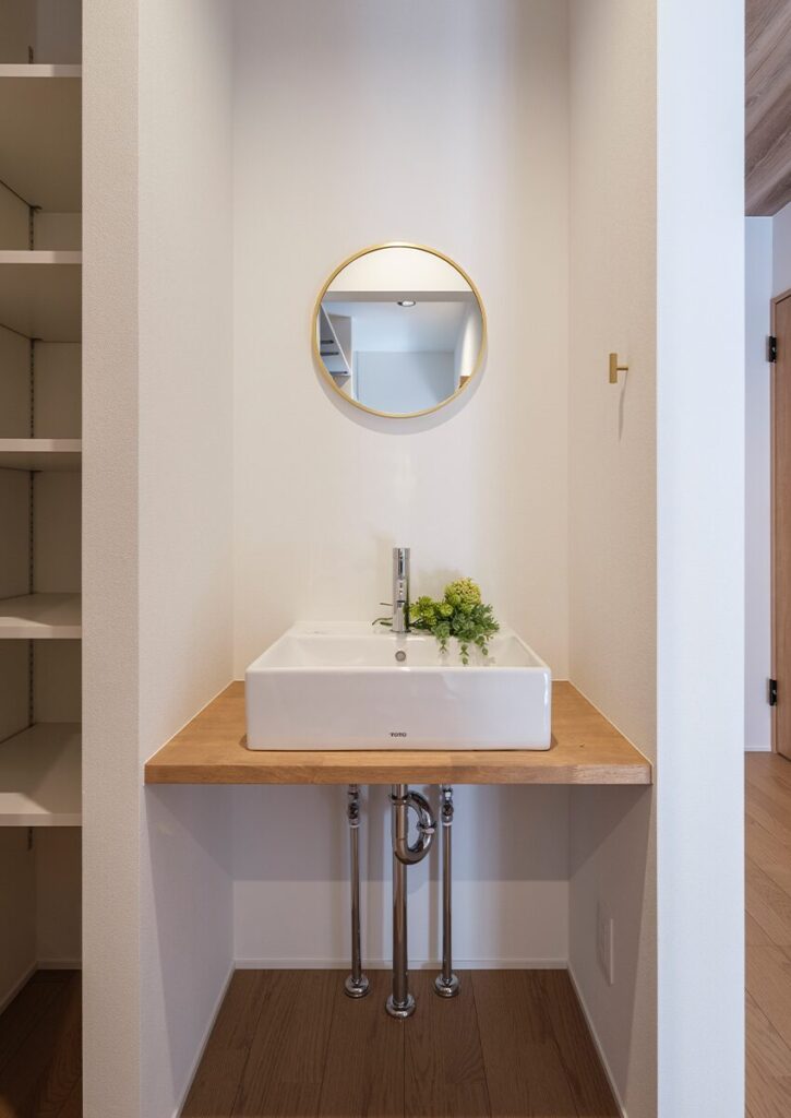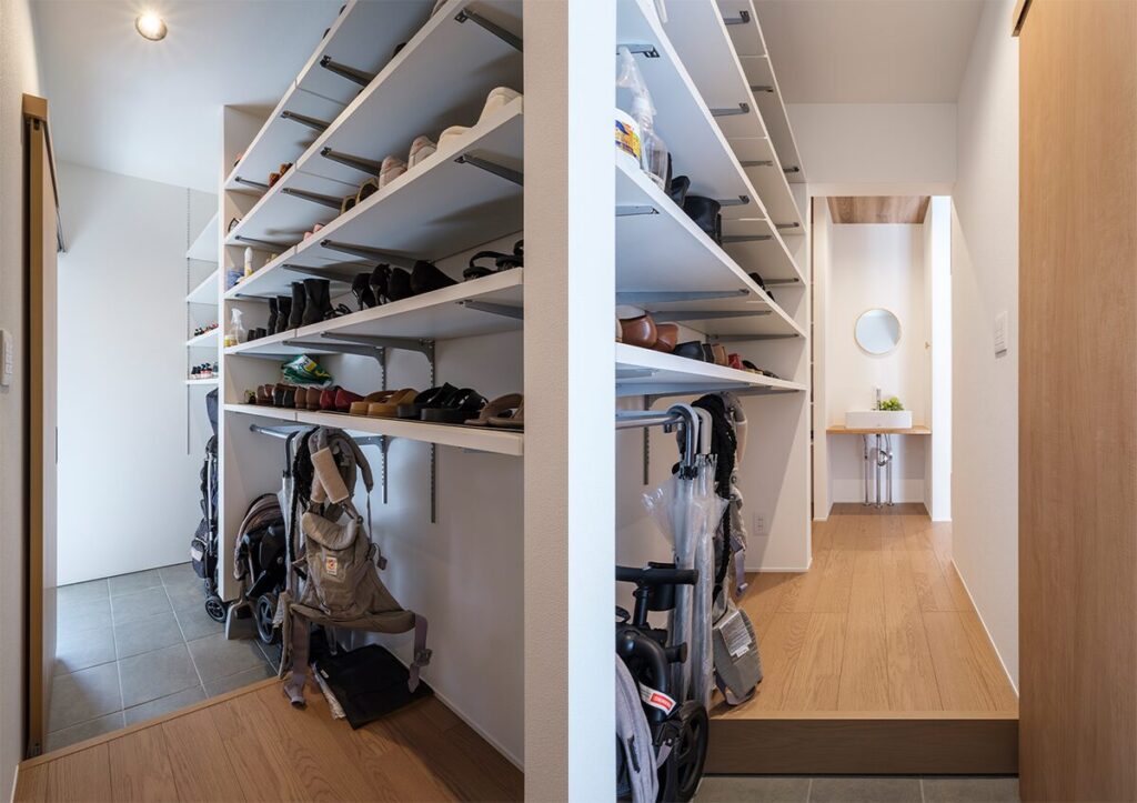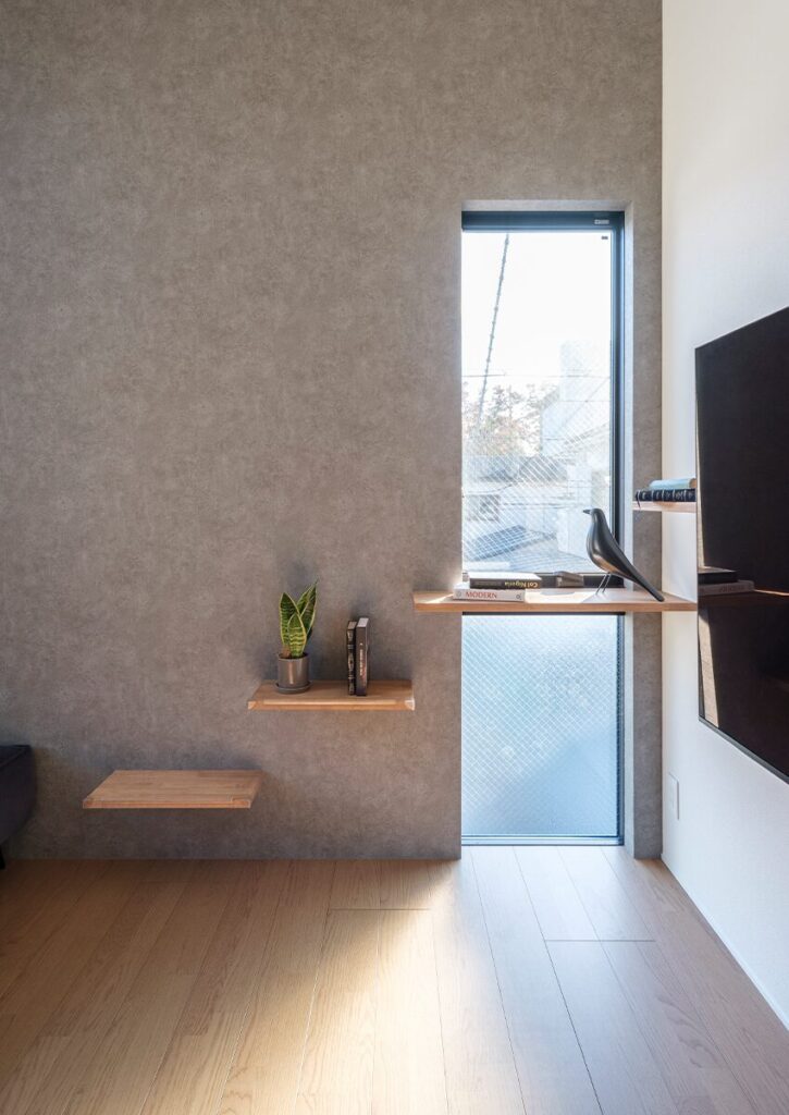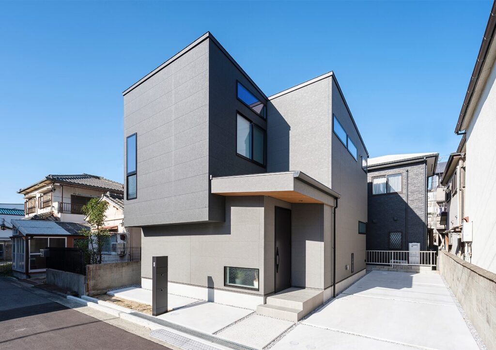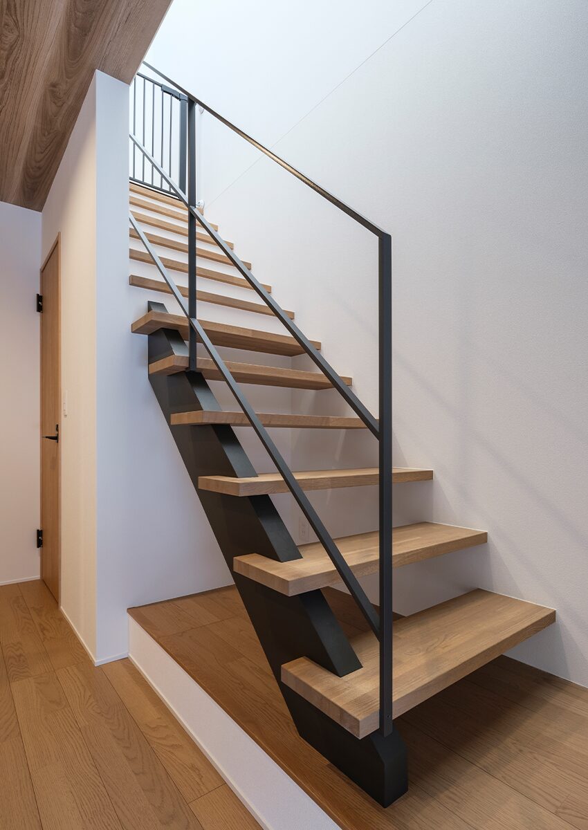 起伏がなく平らな住宅地の中にある敷地での計画です。ご家族はここに周囲からの視線を気にせず、ご家族と愛猫が過ごせる住まいを望まれました。外観はボックス形状と庇を組み合わせ、シンプルながらも印象的な佇まいに仕上げています。内部は1階に各居室を、2階にLDKと水まわりという構成で計画しました。玄関は道路から室内が見えないように側面に配しています。玄関より一歩中に入ると、上部から光が注ぐ階段により、余白と奥行きを期待させる空間が広がります。また、シューズクロークを抜けて手洗い場へ続く家族用動線も確保しています。光に満ちた階段を上がり2階へ向かうと、LDKが広がります。天井高を変えることで、各空間のすみわけをしながら、同じ空間にある心地よさを感じることもできます。高く視線が抜けるリビングで、窓からゆったりと流れる空を眺めながら、愛猫と一緒に寛ぎ集う住まいとなりました。