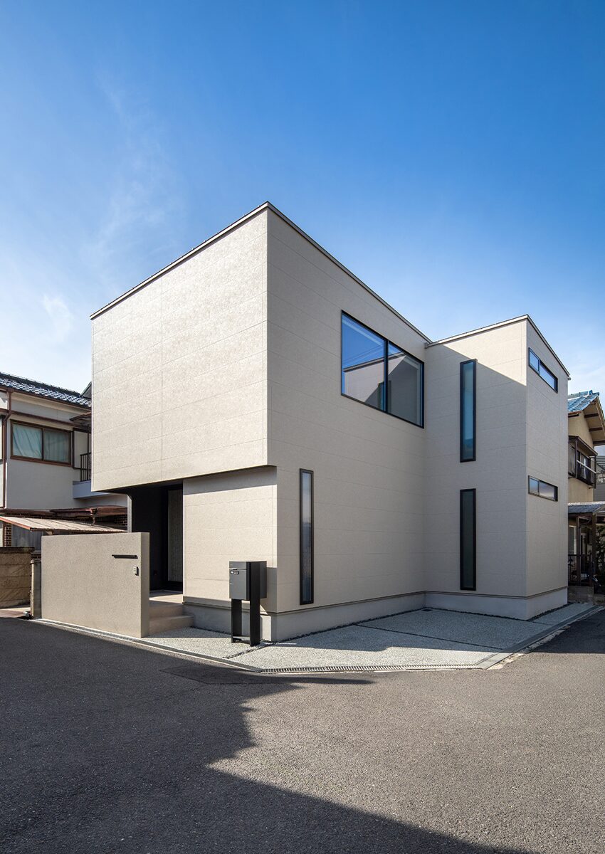 南東角地に位置する、30坪のコンパクトな敷地に立つ住まい。限られた敷地を最大限に活かし、建物と車1台分の駐車スペースを確保。外観はミニマルな箱型フォルムをベースに、凹凸で立体感をもたせ、グレージュの色合いで上品にまとめている