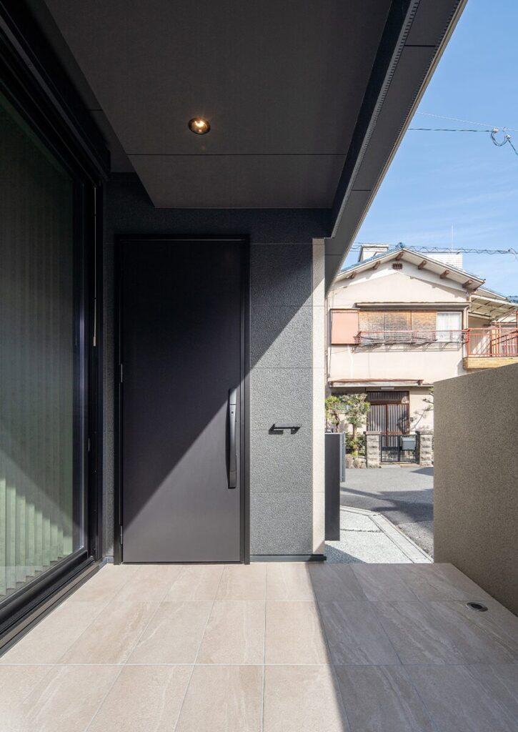 建物が近接する住宅地の中、南と東に接道しているおよそ30坪の角地での計画です。ご家族はここに、LDKと一体となって活用でき、BBQなども楽しめるプライバシーが確保したテラスのある住まいを望まれました。限られた敷地の中で空間を最大限に生かすため、玄関ポーチとテラスの用途を兼ねた計画としました。テラスを塀で囲うことでプライバシーを守りつつ、敷地を有効活用し、最大限の広さを確保しています。また、南側の2階にはあえて窓は設けず、東側に大開口を設けることで、階段と吹き抜けを通じてLDKに光を届ける計画としました。外観は閉鎖的でありながら、室内は朝日が差し込み、大きな開口や上下に広がる空間によって明るい住まいとなりました。