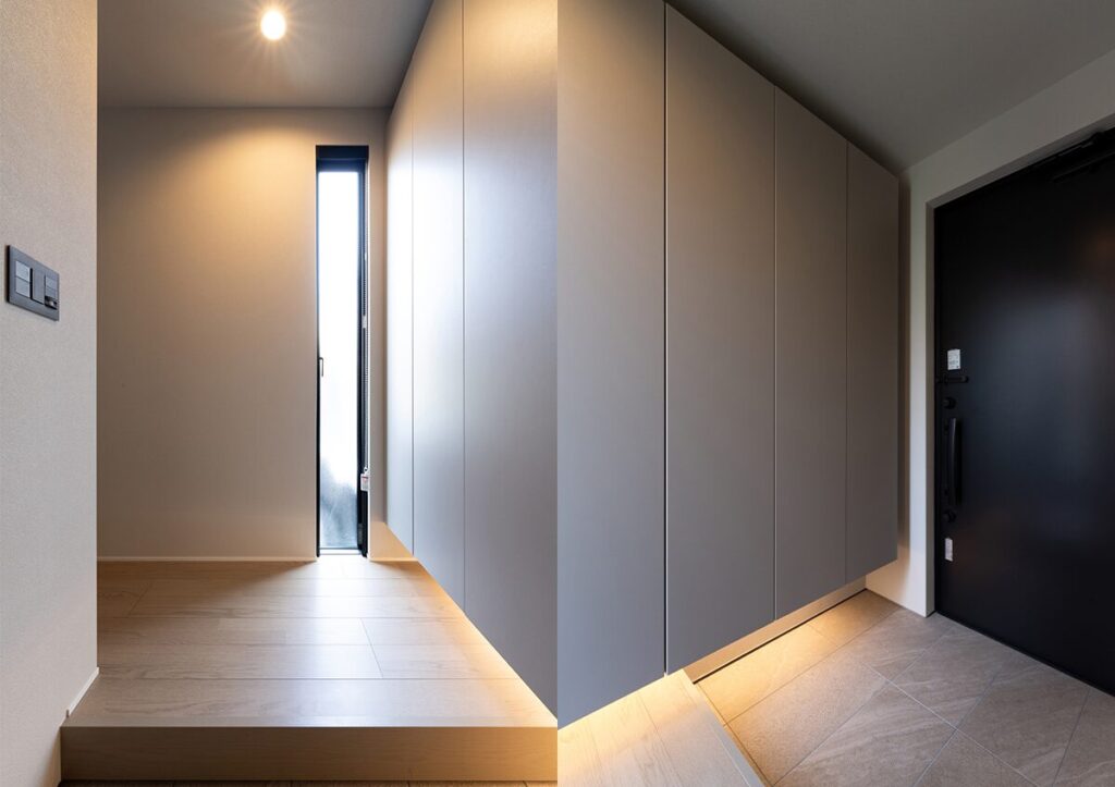 スリット窓からやわらかな光が差し込むコンパクトな玄関。靴やお出かけアイテムを隠せる扉付き収納を壁一面に設け、空間を整えるとともに、浮かせることで軽やかさを演出。間接照明により、奥行きのある表情を生み出した