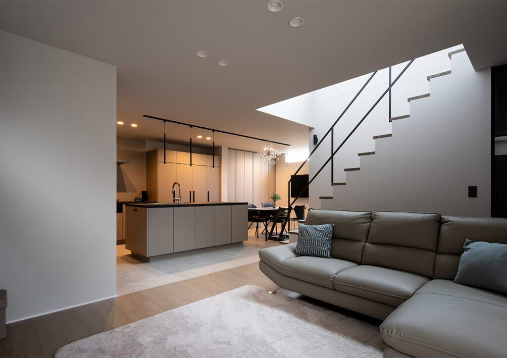 玄関ホールを抜けると、落ち着いた雰囲気のLDKが広がる。コンパクトな敷地ながら25.5畳の広さを確保し、リビングとダイニングキッチンはクランクさせた雁行配置とすることで、ゆるやかなつながりと奥行きのある空間を実現した