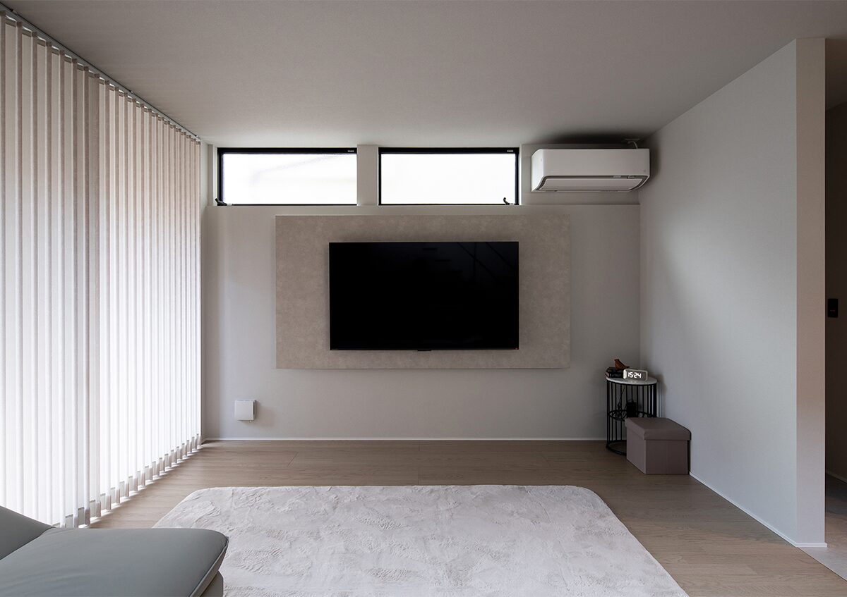 テレビ背面の壁をふかし、上下に間接照明を仕込むことで、奥行きのある空間を演出したリビング。南側の窓を開けると、玄関ポーチを兼ねたテラスへとつながり、帰宅した家族の気配にも自然と気付くことができる