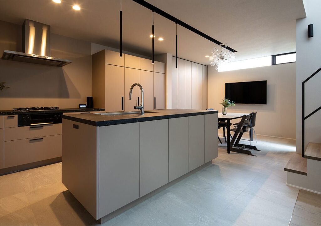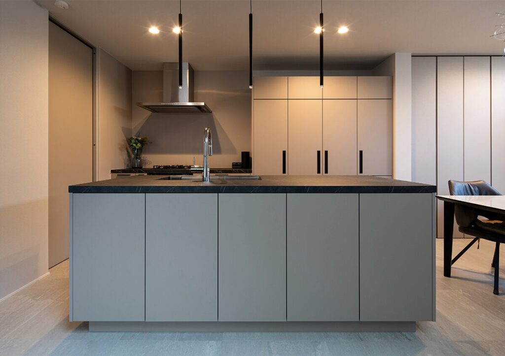 アッシュベージュの扉と石目調のワークトップを組み合わせたグラフテクト製のオープンキッチンが、空間にやさしく溶け込む。グレー・ベージュ・ブラックでまとめ、統一感のある洗練された空間が心地よい暮らしを演出する