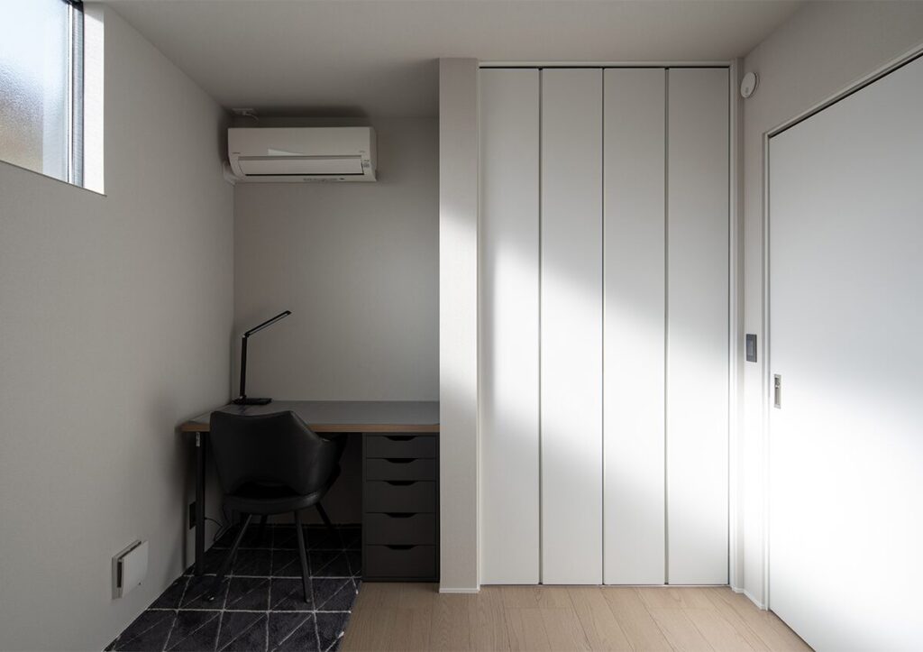 壁とクロゼットの間の凹みを活かし、デスクをぴったりと組み込んだ洋室。デスクを造作のように収めることで空間にゆとりが生まれ、部屋を広く使えるよう工夫。将来は子ども部屋としての利用を想定している