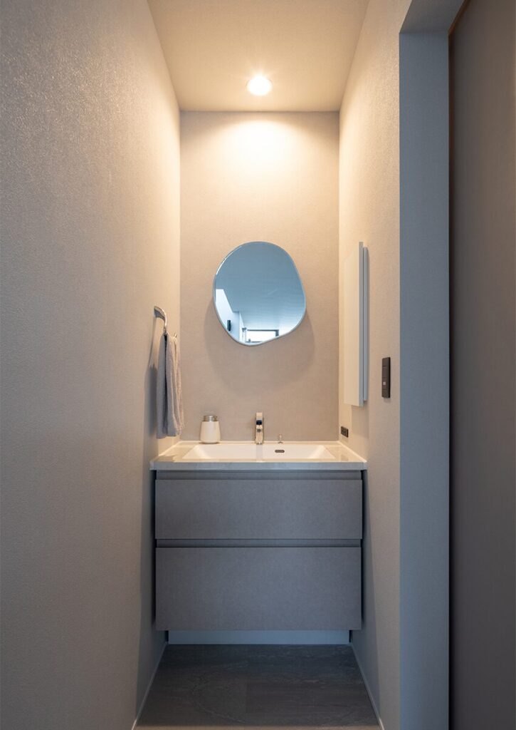 LDKのそばに設けた洗面コーナー。曲線が美しいミラーやタオルリングが、やわらかく上質な雰囲気を演出。カウンター下の引き出し収納や壁面のニッチ収納など、使いやすさにも配慮している