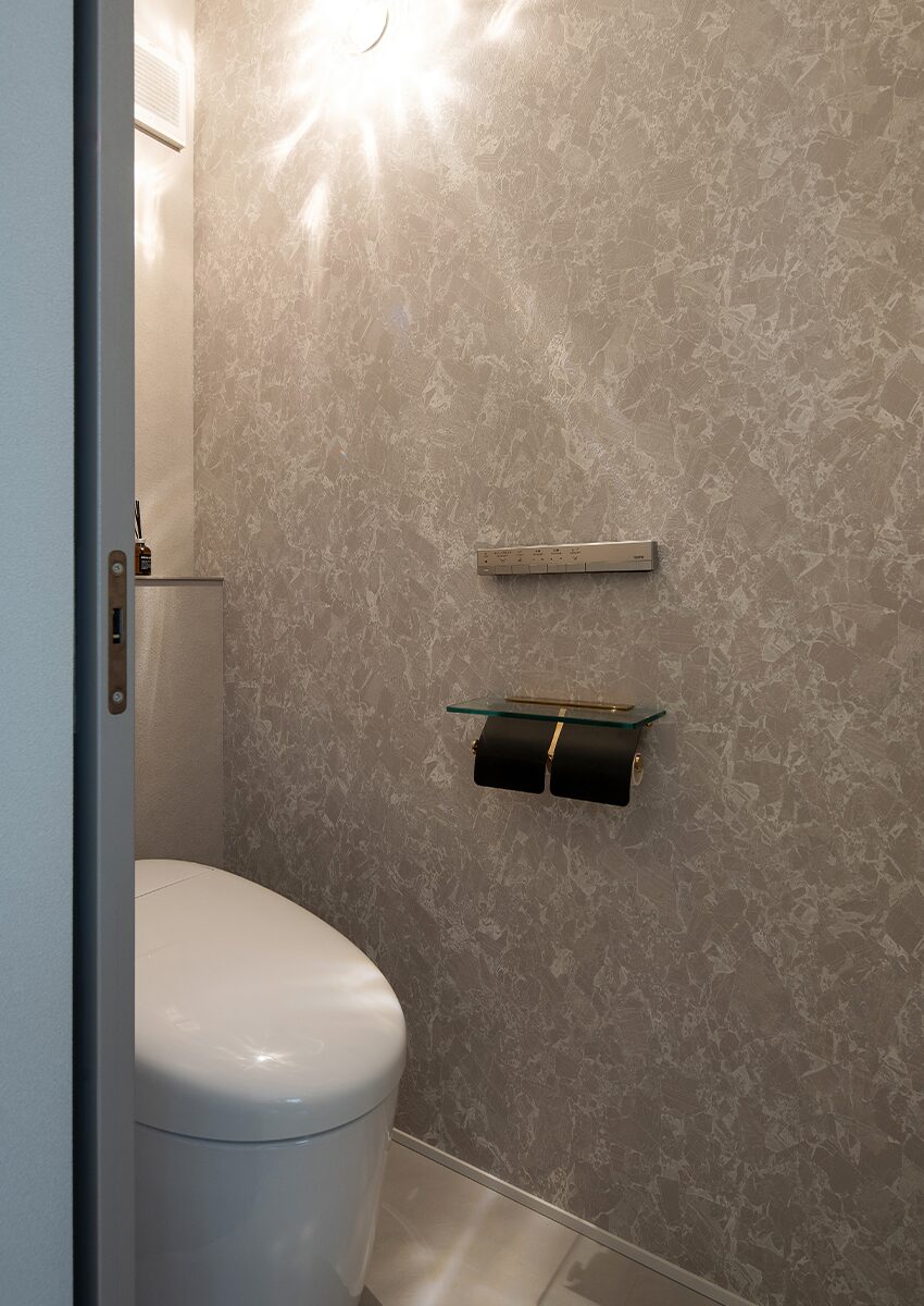 グレーカラーでまとめたお洒落なトイレ。スタイリッシュなテラゾー柄の壁紙をアクセントにあしらい、高級感のある雰囲気に設えた。背面にはふかし腰壁を設け、小物を飾れるスペースを確保した